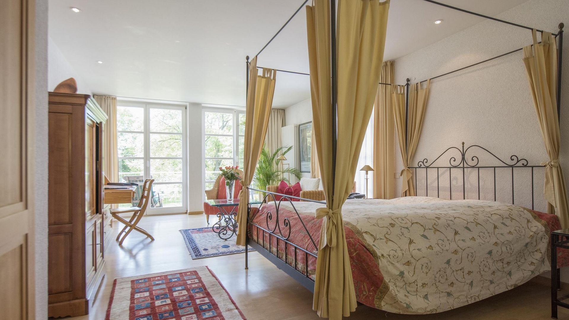 Ein Himmelbett, Pinien- und Eisenmöbel sowie ein Rattan-Sofa repräsentieren den französischen Landhausstil.Das Zimmer ist mit Fensterfront und Balkon direkt nach Süden ausgerichtet.