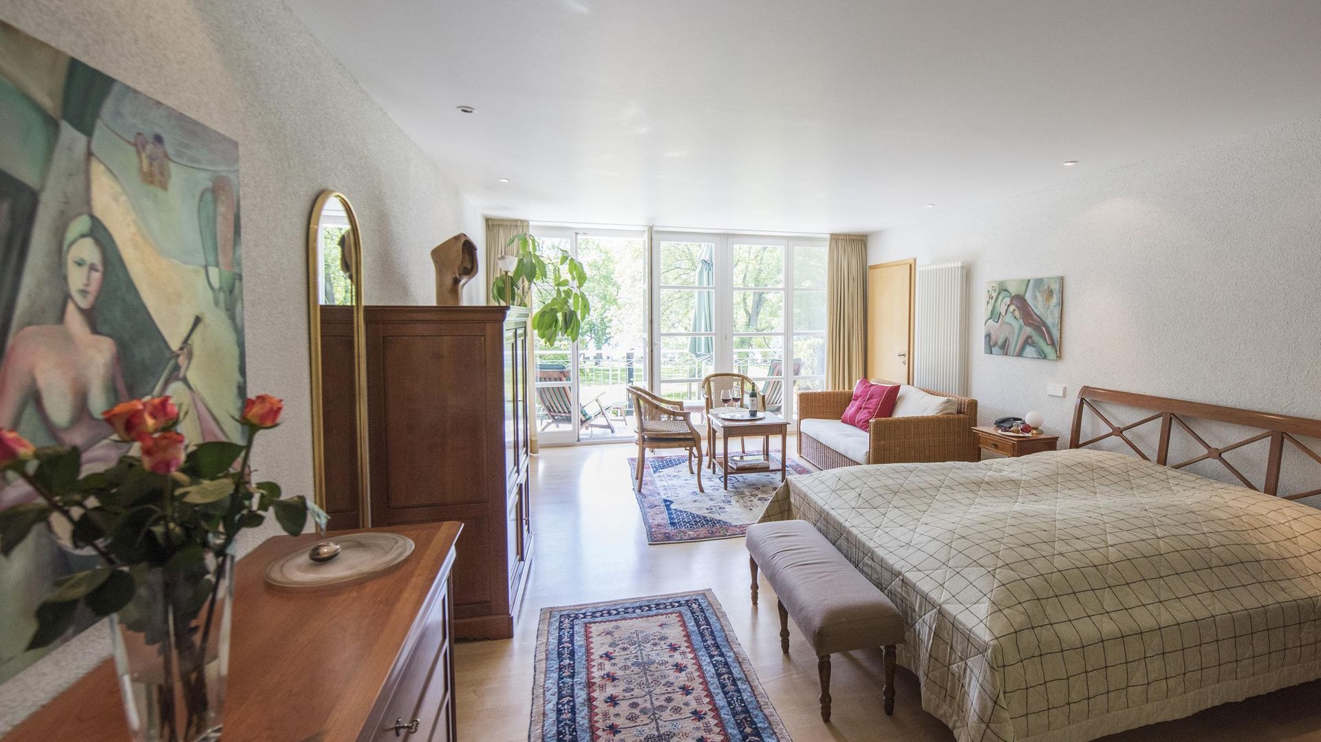Die Einrichtung des Zimmers besteht gänzlich aus klassischen Möbeln in französischer Wildkirsche.Der großzügige Südbalkon bietet eine herrliche Sicht auf See und Kurpark.